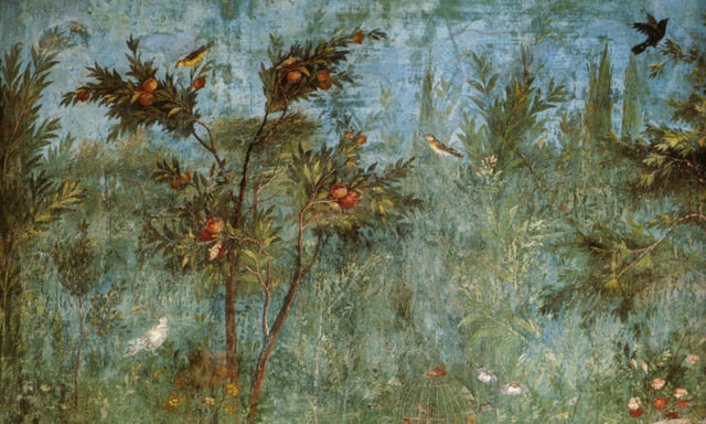 Referenze iconografiche: Wikimedia Commons. Giardino, I sec. a.C., affresco dal Triclinuim,