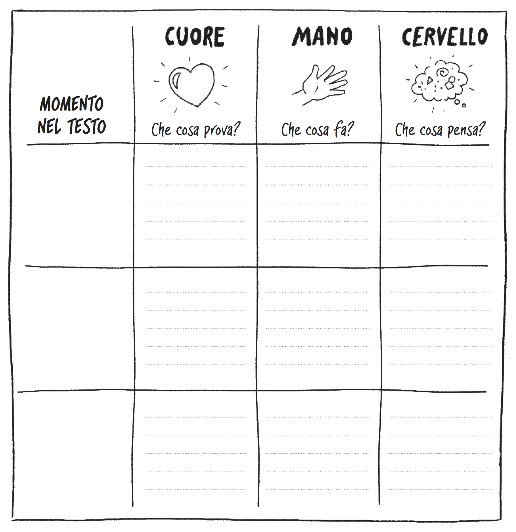 Le prime strategie consentono di immergersi nella storia e sono dedicate alla comprensione e all’evoluzione del personaggio principale, in questo caso Boris. Ho proposto l’organizzatore Cuore, mano e cervello dopo la lettura dei primi due capitoli, al fine di individuare le informazioni esplicite sul personaggio: com’è e che cosa sappiamo di lui.
